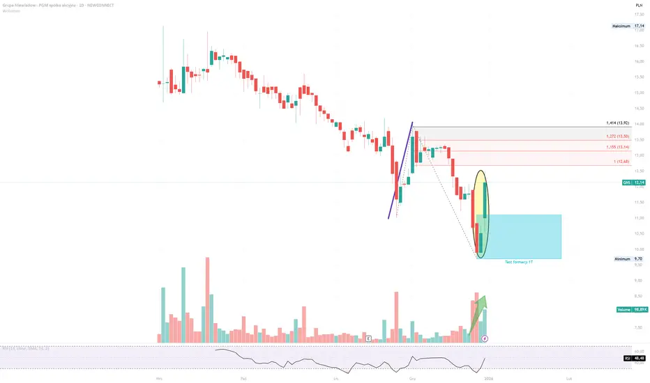 Okres między Świętami Bożego Narodzenia, a Nowym Rokiem to często okres mniejszej intensywności handlu, ale również czas optymalizacji podatkowych i jedną z takich optymalizacji najprawdopodobniej widzimy na tym wykresie. Cena ładnie wystrzeliła wracając powyżej poziomu cenowego sprzed lokalnego wzrostu wolumenu. Może to zwiastować koniec spadków i rozpoczęcie trendu wzrostowego.