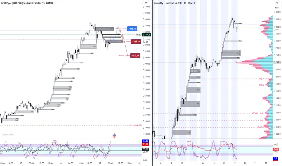 - Cena znajduje się w aktywnej strefie FVG + S1/S2 classic (3329–3325).