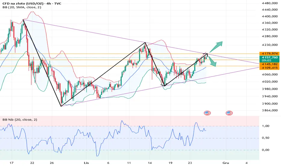 Na wykresie godzinowym widać, że złoto kontynuowało trend wzrostowy podczas sesji europejskiej. Wstęgi Bollingera zmierzają w górę, a formacja świecowa znajduje się w kanale wzrostowym. Opór widoczny jest w okolicach 4180, a dalszy opór występuje na poziomie 4200. Wsparcie widoczne jest w okolicach 4150-4145.