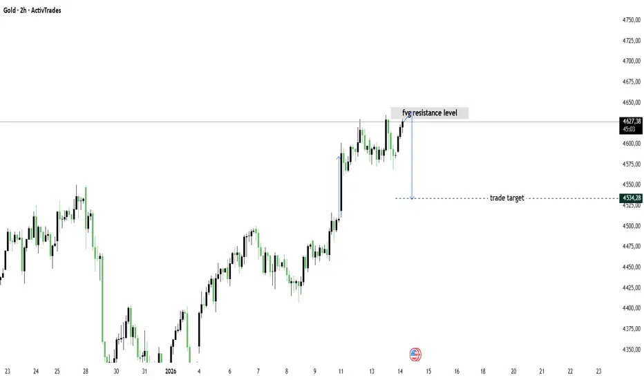 Cena złota znajduje się w silnym trendzie wzrostowym, co potwierdza sekwencja coraz wyższych szczytów i dołków. Po dynamicznym impulsie wzrostowym rynek dotarł do strefy oporu (FVG resistance level) w okolicach 4625–4630.