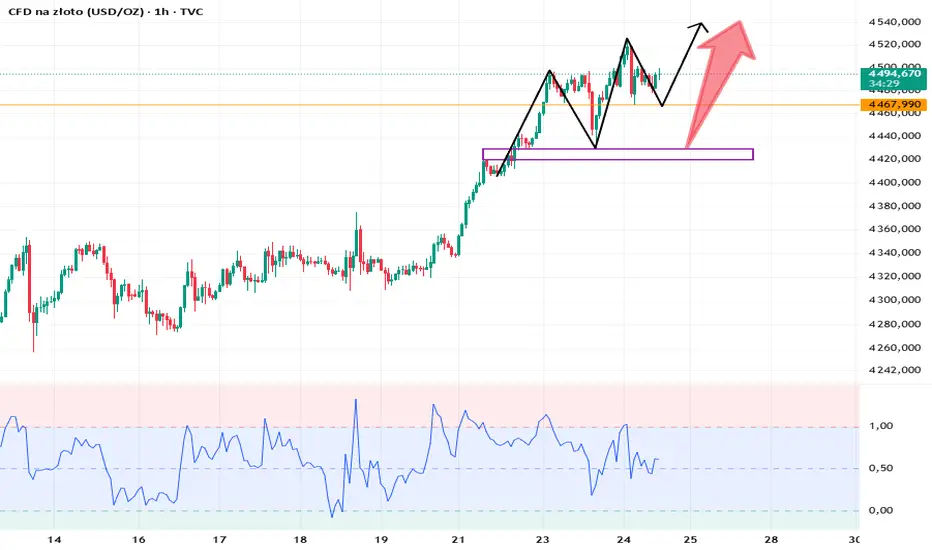 Wykres 1-godzinny pokazuje konsolidację ceny na wysokich poziomach. Obecna struktura nadal sprzyja bykom, ale Wstęgi Bollingera zwężają się, co wskazuje na spowolnienie dynamiki wzrostowej. Krótkoterminowe wsparcie znajduje się w okolicach 4470. Po odbiciu formacji technicznej, może ona nabrać impetu do kolejnego odbicia. Strategia handlowa polega na kupnie po potwierdzeniu wsparcia.