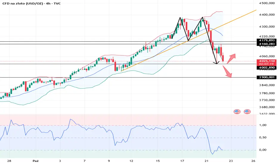 Złoto dwukrotnie przetestowało poziom wsparcia na poziomie 4000 USD. Należy obserwować kontynuację krótkoterminowego trendu spadkowego. Średnia ruchoma ceny przebiła linię trendu wzrostowego w krótkim terminie, a wskaźniki są w fazie odbudowy, ale Wstęgi Bollingera pozostają w górę. Poziomy 4170/4180 USD na wykresie dziennym są kluczowe. Jeśli zostaną one skutecznie odbite, rynek jest gotowy na silny wzrostowy powrót. W przeciwnym razie rynek będzie nadal spadał w krótkim terminie, szukając wsparcia. Skup się na poziomie wsparcia 4000. Przełamanie tego poziomu doprowadzi do dalszych spadków, z celem na poziomie 3900.