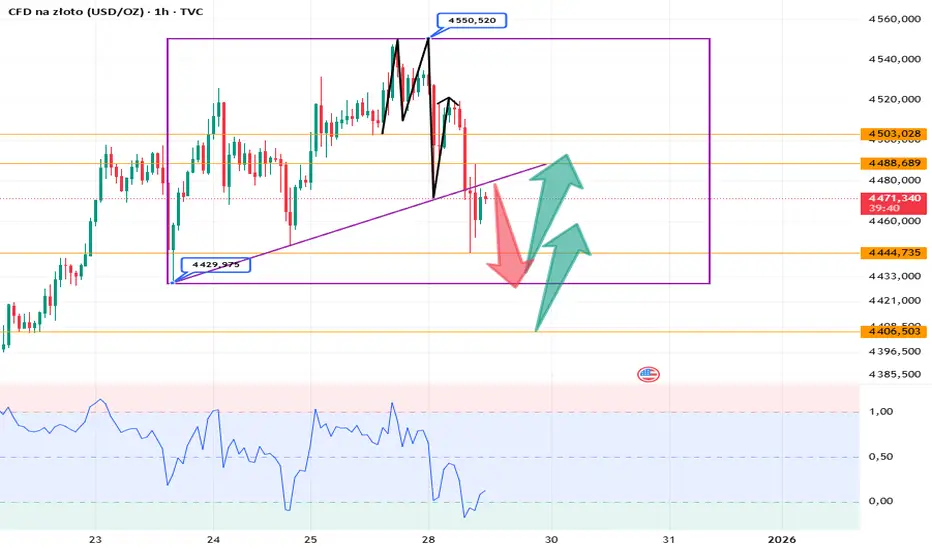Na wykresie godzinowym akcja cenowa znajduje się na wysokim poziomie, tworząc formację podwójnego szczytu, po której następuje gwałtowny spadek. Cena przebiła się poniżej linii wsparcia trendu wzrostowego, a krótkoterminowa koncentracja koncentruje się na kontynuacji momentum spadkowego. Obecnie uwaga skupia się na dolnej krawędzi górnego zakresu konsolidacji, gdzie istnieje pewne wsparcie. Obecna struktura nadal sprzyja kupującym, a spowolnienie momentum wzrostowego jest zgodne z potrzebą korekty po ostatnim gwałtownym wzroście i odzwierciedla również oczekiwania realizacji zysków na wyższych poziomach przed Nowym Rokiem. Poziomy wsparcia, które należy obserwować, to okolice 4445/4430. Krótkoterminowa strategia to oczekiwanie na korektę i poszukiwanie poziomów wsparcia do zakupu.