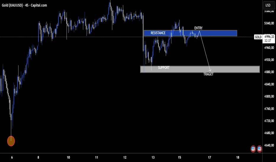 Wykres 45-minutowy Gold (XAUUSD) pokazuje wyraźną reakcję ceny w strefie oporu w okolicach 5 000. Struktura sugeruje możliwy scenariusz spadkowy z celem w kierunku strefy wsparcia 4 880–4 900.