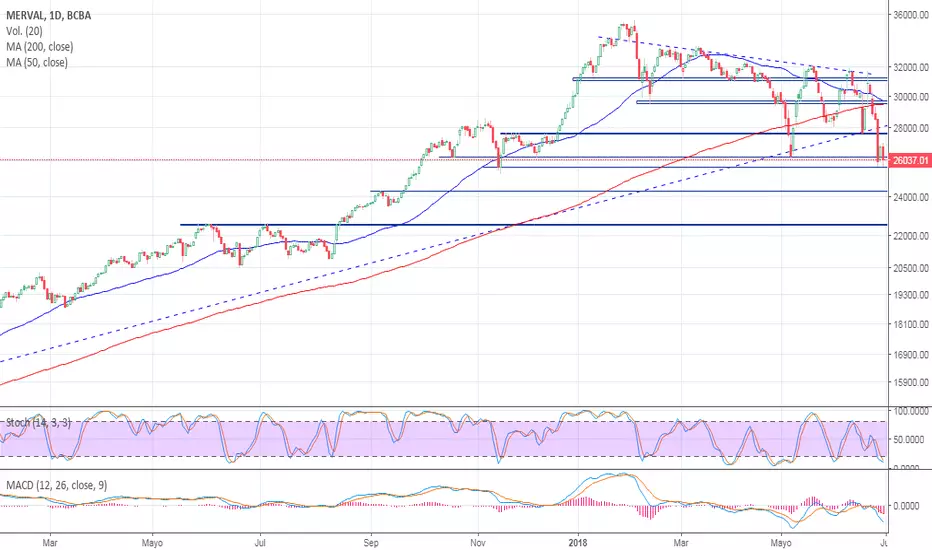 A la baja creo quedó bastante clara que la última línea de esperanza son los mínimos de las ruedas de esta semana, los 25700/26000... Un quiebre bajista de estos valores habilitaría una continuación a los 24000 aprox (hay un rango 23600/24300 en el que podría detenerse) y de no frenar ahí a los 22500 puntos, por lo cual no hace falta aclarar que esta zona es crucial para los movimientos de corto
