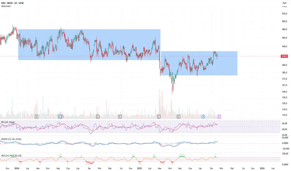 We wspomnianym okresie kurs wzrósł o 118%, a od stycznia 2024 mamy konsolidację, która najpierw była w zakresie 410-480zł, a obecnie jest to 380-430zł z okresowym wybiciem nawet na poziom 344zł.