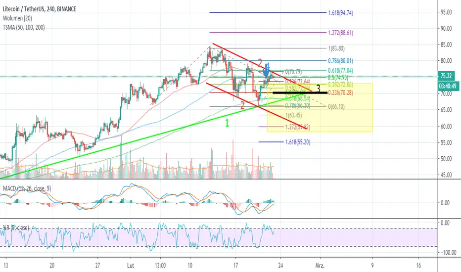 UPDATETendencja spadkowa nr 2 została wybita szybciej niż podejrzewałem, więc teraz czekamy na prawdopodobny retest tendencji spadkowej nr 2 i o ile cena wróci do kanału spadkowego nr 2 to następnymi ważnymi ważnymi obszarami są wcześniej wspomniany poziom fibo i strefa wolumenu. W tej wersji wydarzeń reakcja cenowa powinna nastąpić w granicach 72.75 $ - 70.25 $.