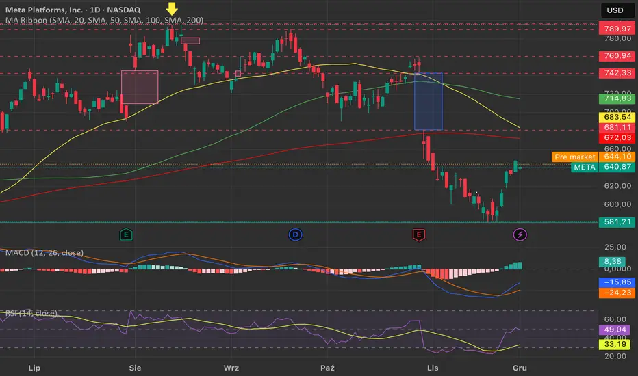 Meta weszła w okres odbicia po silnej korekcie z listopada, ale wciąż znajduje się pod ważnymi średnimi MA50 i MA100. Cena obecnie testuje pierwsze opory w okolicach 640 USD.