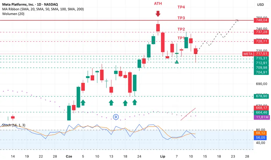 Meta nam troszke uciekła pod koniec tygodnia po silnym trendzie wzrostowym ale nie wszystko stracone! W zeszłym tygodniu Meta dała nam pare okazji do zarobienia i Ci, którzy zainwestowali, zyskali, a obecnie znajdujemy się na tym samym poziomie cenowym co w zeszłym tygodniu. W piątek cena ustabilizowała się powyżej linii wsparcia (wsparcie na poziomie 515 USD), a wszystkie średnie kroczące (MA20, MA50, MA100) są poniżej wykresu, co potwierdza przewagę byków.