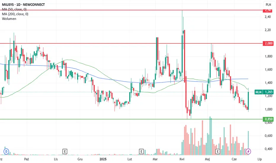 Jeszcze na pod koniec stycznia br. kurs giełdowy Milisystem oscylował na poziomie ok. 1 zł, rosnąc powoli w kolejnych tygodniach najpierw do poziomu 1,2 zł, a następnie 1,3 zł. Mocniejsze wybicie nastąpiło pod koniec lutego, gdy spółka poinformowała o zawarciu istotnej współpracy technologicznej z podmiotem z branży, której celem jest stworzenie jednego i zintegrowanego systemu trenażera laserowego, a następnie jego wspólny rozwój i dystrybucja. W efekcie obserwowaliśmy zwiększone zainteresowanie rynkowe walorami Milisystem, a notowania giełdowe w kilka sesji poszybowały z poziomu ok. 1,3 zł na ponad 2 zł za jedną akcję. W następnych tygodniach nastąpiła korekta i powrót w okolice 1,4 zł. Kolejny mocniejszy impuls wzrostowy nastąpił 1 kwietnia br., gdy firma technologiczna z rynku NewConnect poinformowała o uzgodnionym Memorandum Inwestycyjnym z partnerem z branży militarnej, na mocy którego Milisystem zostanie inwestorem kapitałowym w sektorze produkcji amunicji małokalibrowej. Informacja przełożyła się na potężny wzrost kursu giełdowego do poziomu 2,5 zł. Od tego momentu obserwowaliśmy wyraźnie zwiększone obroty sesyjne, które przełożyły się również na przetasowania poziomów zaangażowania kapitałowego poszczególnych akcjonariuszy. Część inwestorów wykorzystała wzrost zainteresowania rynkowego do realizacji zysków, co spowodowało spadek notowań ponownie w okolice 1 zł, a następnie stopniowe wzrosty i osiągnięcie 2 zł za jedną akcję. Przez ostatnie 1,5 miesiąca wyrysował się trend spadkowy na akcjach Milisystem, który przełożył się na ponowny retest cenowy na poziomie 1 zł i odbicie w górę w kierunku 1,2-1,3 zł.