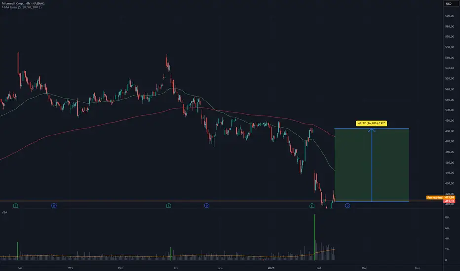 Akcje Microsofta znajdują się obecnie w wyraźnej fazie silnej przeceny po szczycie z października/listopada 2025 (~540–550+ USD), gdzie doszło do klasycznego wybicia i późniejszego załamania trendu wzrostowego. Spadek od szczytu wyniósł już ~24–25%, a w samym 2026 roku kurs stracił ponad 15–16%.