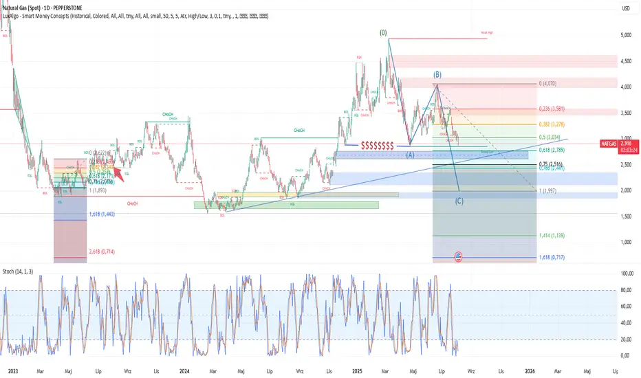 Po kolejnej fali eliottta w cyklu korekcyjnych wchodzimy w ciekawe miejsce. Na wykresie widoczna jest korekta prosta ABC, natomiast wieloktotnie spotkałem się z sytuacją, gdy odcinek BC jest zniesieniem fibo 0,618 dla odcinka 0-A. Czy jest to okazja na zakupy, czy czysto spekulacyjny ruch? Sytuacja geopolityczna i koflikty na bliskim wschodzie często popychały NATGAS ku górze. Jak będzie tym razem? $$$$ zaznaczona jest płynność, która wg mnie powinna zostać wybita i dopiero możemy liczyć na swing powyżej wierzchołka B.