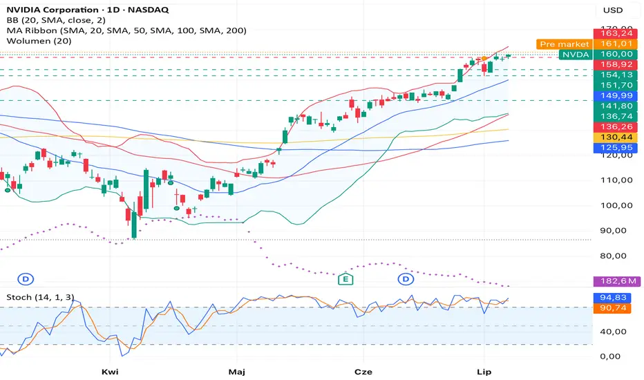 Technicznie NVIDIA utrzymuje się w silnym trendzie wzrostowym, ale Stochastic i górna wstęga Bollingera sugerują, że krótkoterminowa korekta może być zdrowa. Długoterminowo perspektywy pozostają bardzo pozytywne.
