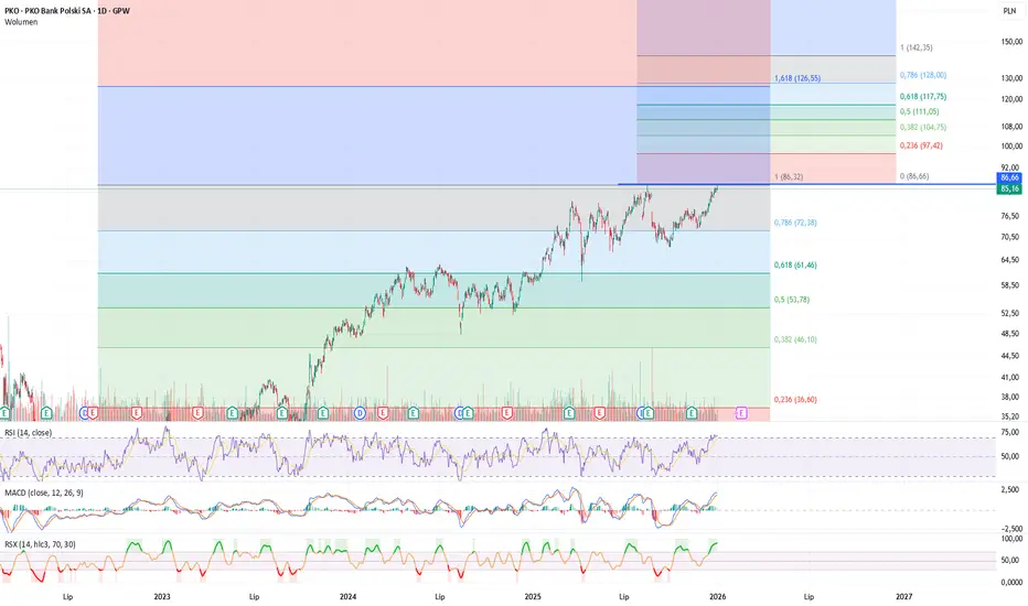 PKO BP znajduje się w silnym trendzie wzrostowym od września 2023, kiedy to z poziomu 33zł rozpoczął mocny ruch w górę osiągając stopę zwrotu na poziomie 157%.