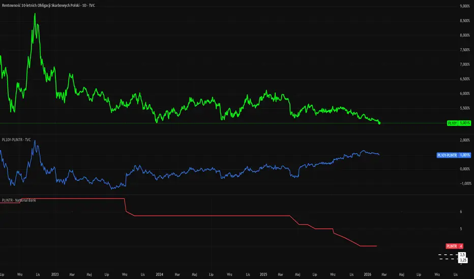 Choć nominalnie rentowność obligacji spada do poziomu 5%, to względem stopy referencyjnej jest nadal o punkt procentowy wyższa i w ostatnim czasie wręcz ta różnica się powiększała.