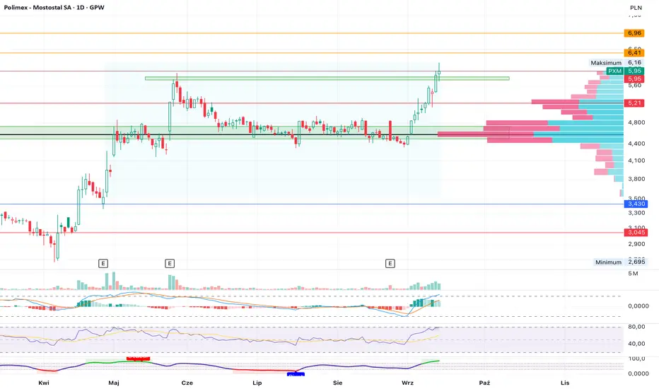 Profil wolumenu potwierdza układ widoczny na zniesieniach Fibonacciego i klasycznych poziomach wsparć/oporów: największa walka toczyła się w rejonie 4,6–4,8 zł, natomiast powyżej 6 zł rynek wchodzi w „pustą przestrzeń”, gdzie ruchy mogą być szybsze i bardziej dynamiczne. Dlatego wybicie powyżej 6,41 zł będzie szczególnie ważne – bo otworzy drogę do dalszych wzrostów w obszarze, gdzie brakuje silnych stref podaży.