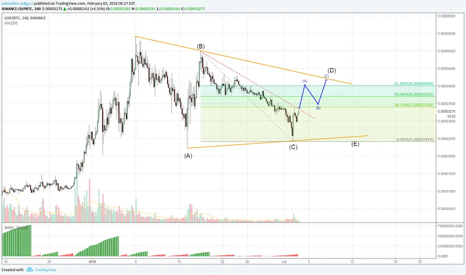 Cena cryptowaluty Quantstamp QSPBTC wykonała trzy fale korekty horyzontalnej, najprawdopodobnie w formie trójkąta symetrycznego. Pozostały do wykonania podfale D oraz E. Najblizsza linia trendu, przerywana czerwona, ograniacza potencjał wzrostowy byków. Wybicie powyżej 38% Fibo może przynieść trójfalowy ruch wzrostowy.