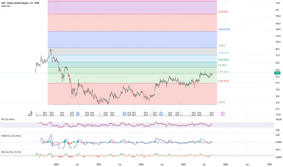 W mojej ocenie Shoper znajduje się w ciekawym miejscu – kurs odbudował się po wcześniejszych spadkach i konsoliduje tuż nad ważnym poziomem zniesienia Fibonacciego 38,2%. Być może mamy do czynienia z bazą pod dalszy ruch w stronę 58–66 zł. RSI ostrzega przed krótkoterminowym przegrzaniem, więc możliwe, że czeka nas najpierw lekkie cofnięcie. Scenariusz pozytywny zakłada wybicie powyżej 52 zł i ruch w kierunku kolejnych zniesienia Fibonacciego. Scenariusz negatywny to zejście pod 48 zł i powrót w rejon 40 zł czyli 23,6%.