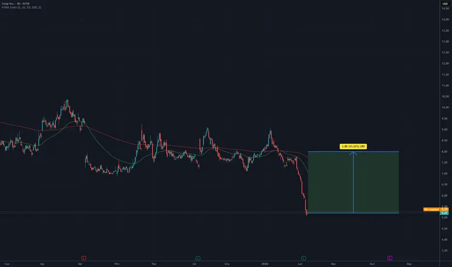 Na wykresie widać silny, dynamiczny spadek ceny, który doprowadził kurs w okolice poziomu ok. 5,2 USD. Tak gwałtowny ruch w dół często prowadzi do krótkoterminowego wyprzedania rynku, co zwiększa prawdopodobieństwo technicznego odbicia. Obecna strefa cenowa może działać jako wsparcie, ponieważ cena zatrzymała się w pobliżu wcześniejszych reakcji popytowych, a świece wskazują na próbę stabilizacji po impulsie spadkowym.
