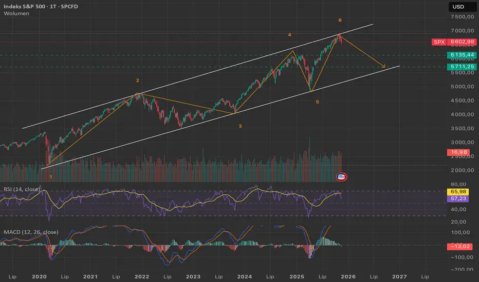 Na tym wykresie tygodniowym połączyłam wszystkie dołki i wierzchołki i pięknie widać, że SPX od 2020 roku powtarza ten sam schemat: silny impuls wzrostowy, dojście do oporu i później kilkutygodniowe schłodzenie rynku. I wygląda na to, że dokładnie taki sam etap zaczyna się teraz. Wskaźniki też to potwierdzają. RSI na tygodniowym wykresie odwraca się z wysokich poziomów, co oznacza, że kupujący na chwilę tracą siłę. MACD również zaczyna skręcać w dół – a na tak dużym interwale to zwykle oznacza korektę, a nie chwilowe wahanie przez dwa dni. To naprawdę nie jest nic dramatycznego.