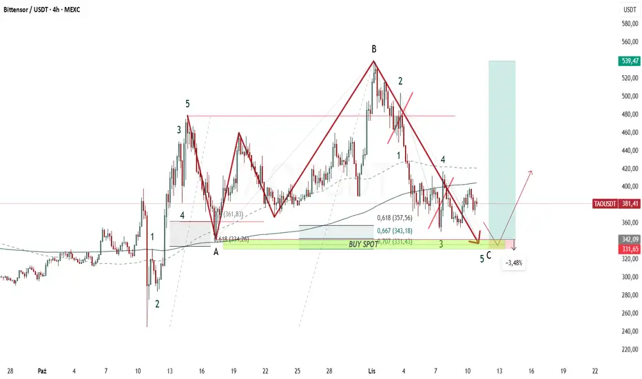 Po likwidacjach na rynku krypto z 10 X dostajemy ładne odbicie na TAO. Jeśli cena wybije dołek fali A, powstanie układ korekty nieregularnej z potencjalnym ciasnym wejściem. Za miesiąc ma miejsce halving na TAO. Szansa na dołączenie do wzrostów? Oby. Zajęcie pozycji z poziomu.