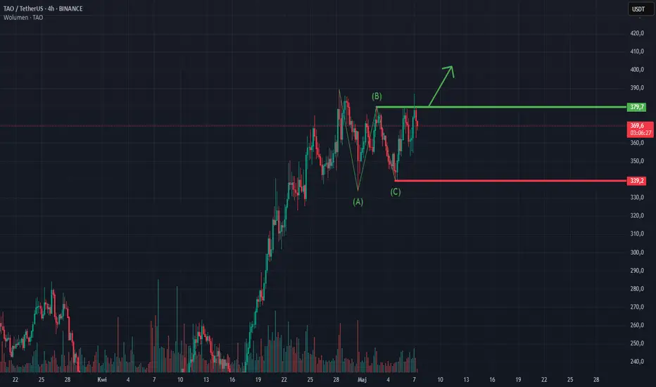 #TAOUSDT - 07.05.2025 - Po ponownym wybijaniu punktu B korekty możliwa kontynuacja trendu wzrostowego (lokalnie). Przebicie punktu C będzie negacją scenariusza. Można rozegrana h4: jak bedzie przy wybiciu punktu B i jeżeli po wejściu w pozycje jakaś h4 zamknie się poniżej punktu B na czerwono to wtedy można wyjsc z pozycji na niewielkiej stracie. Nie jest to porada inwestycyjna :)
