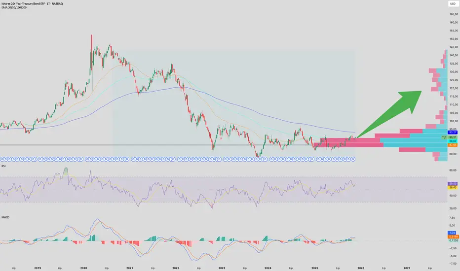 Rzut oka na "tygodniówki" (1W) na TLT (iShares 20+ Year Treasury Bond ETF). Od 2020 roku dostaliśmy mocno w kość, ale struktura, którą budujemy od końcówki 2023, wygląda coraz bardziej na klasyczną akumulację.
