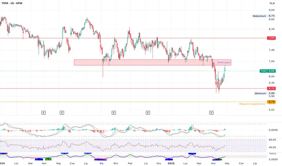 Akcje Toya znajdują się obecnie w fazie odreagowania po dynamicznym spadku z rejonu 7,85 zł. Po osiągnięciu lokalnego dna na poziomie 5,99 zł, kurs wyraźnie odbił w górę i aktualnie znajduje się w okolicach 6,68 zł.