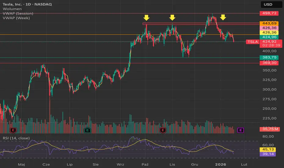 Cena Tesli na pre-market jest nad główną linią wsparcia. Jeżeli to wsparcie nie utrzyma ceny, to wtedy mamy przestrzeń na short. Naturalne TP to okolice 383 USD albo niżej 369 USD, gdzie przebiega SMA 200, czyli rejon sprzed wrześniowej akumulacji, zanim Elon wykupił akcje Tesli.
