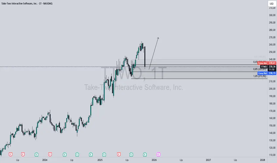 Po ogłoszeniu przesunięcia premiery GTA 6 rynek zareagował bardzo dynamicznie – na wykresie tygodniowym (W1) widzimy silną, jednolitą świecę spadkową, która sprowadziła cenę z okolic ostatnich szczytów w rejonie $270–$280 w kierunku strefy wsparcia wyznaczonej przez poziomy Fibonacciego.
