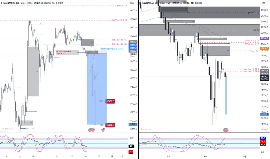 - Alternatywa: SELL z imbalance D1 (14.04) – poziom 18 830,1 jako fallback dla reakcji rynku.