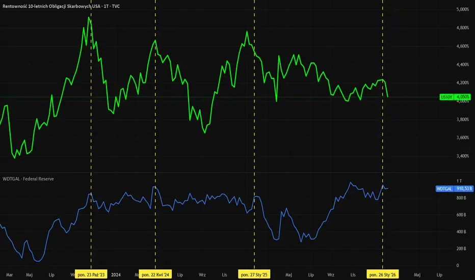Dotychczasowa historia wskazuje, że spadek salda TGA zazwyczaj w pewnym stopniu pokrywał się ze spadkiem rentowności obligacji. Jeśli podobnie będzie i tym razem (historia nigdy nie jest gwarantem przyszłych zdarzeń), rentowność 10-latek może spaść jeszcze niżej.