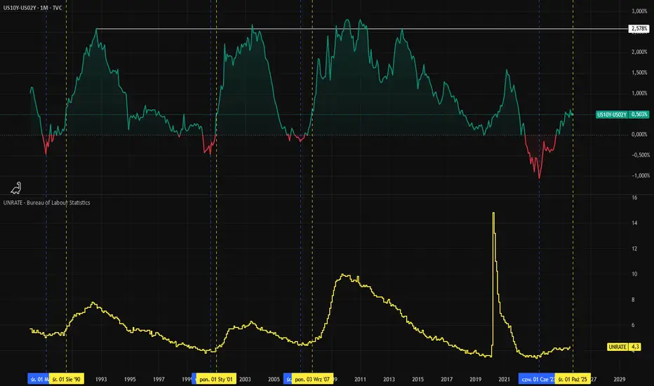 UNRATE w kontekście pokrywania się dołków spreadu obligacji