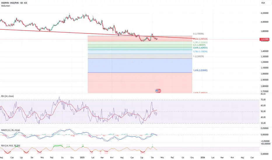 Na parze USDPLN widać wyraźny trend spadkowy, a obecnie kurs testuje ważną linię wsparcia wynikającą z długoterminowego układu technicznego. Po odbiciu w okolice 3,75 rynek ponownie kieruje się w dół, a ostatnie zamknięcie w rejonie 3,63 pokazuje, że presja podażowa wciąż dominuje.
