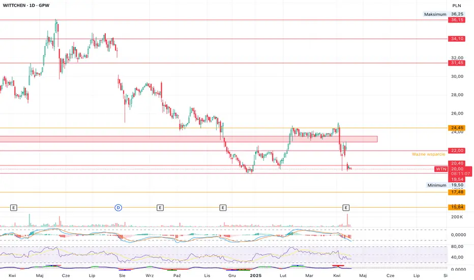 Analizując oscylatory RSI ma jeszcze miejsce do zejścia i nadal sygnalizuje nam możliwe spadki, jednak warto zwrócić uwagę, że byki mogą postarać utrzymać się poziom 19,5 zł dopóki nie przełamią ostatniego lokalnego dołka na RSI. MACD nadal wygląda negatywne kurs zszedł poniżej -10 pkt i póki co nie ma sygnałów odwrócenia spadkowego trendu.