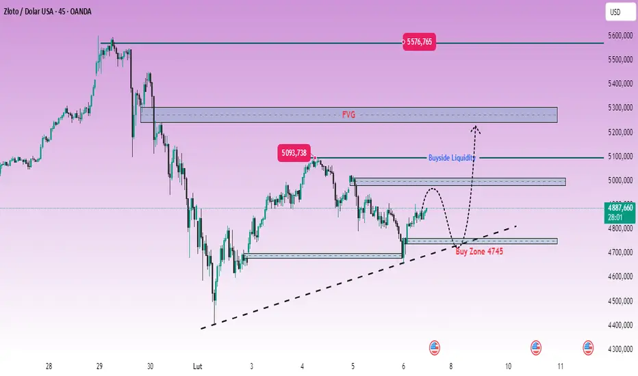 Kluczowa strefa zakupu: 4745 (linia trendu + zbieżność popytu)