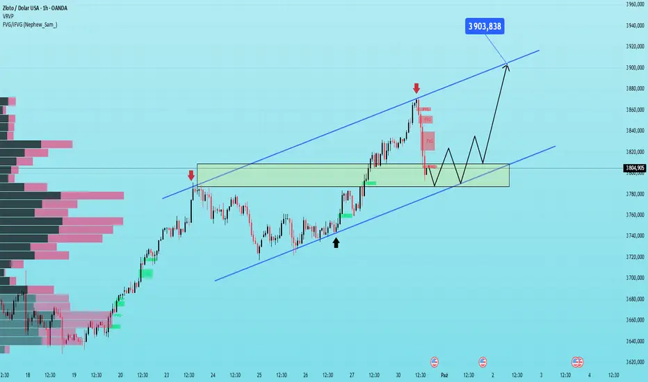 Złoto powróciło, aby przetestować strefę konfluencji 3780-3800 po korekcie. Jest to ważna strefa wsparcia, pokrywająca się z dolną linią trendu kanału wzrostowego i charakteryzuje się dużym wolumenem obrotu skoncentrowanym na VPVR → prawdopodobnie stanie się punktem zwrotnym dla kolejnego trendu wzrostowego.