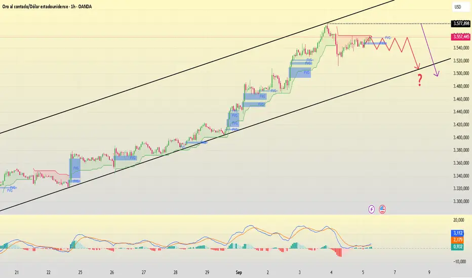 Actualmente, el oro en la bolsa OANDA, tras una fuerte subida hasta la zona de los 3.577 $, muestra señales de desaceleración, ya que sufre un continuo rechazo en torno a esta resistencia. La formación consecutiva de pequeñas zonas de FVG muestra que los vendedores están empezando a aprovechar la presión de toma de beneficios a corto plazo. El MACD en el gráfico de 1 hora muestra una ligera señal de divergencia bajista, mientras que el histograma se estrecha gradualmente, lo que advierte de una posible reversión temporal.