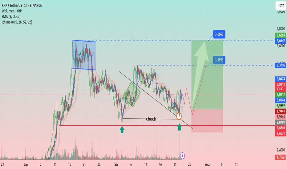 Wykres XRP/USDT (1H) pokazuje strukturę wzrostową po potwierdzeniu Change of Character (CHoCH) w pobliżu strefy wsparcia na poziomie 2,94 $. Cena uszanowała kluczową strefę popytu (zielone strzałki) i przełamała spadkową linię trendu, co sygnalizuje możliwą zmianę kierunku.