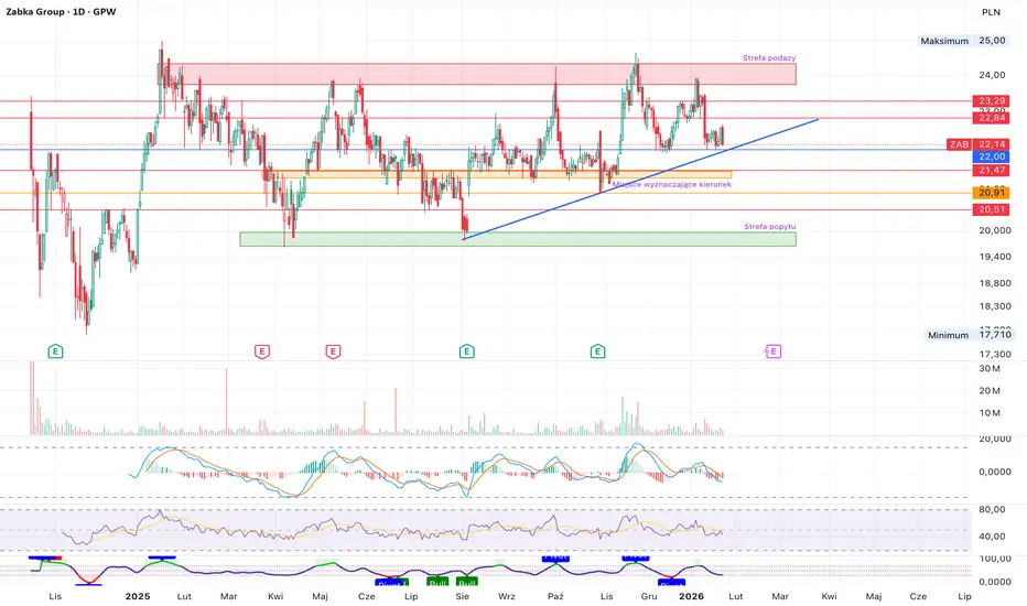 Kurs akcji Żabki od wielu miesięcy porusza się w szerokiej konsolidacji, której główny zakres wyznaczają okolice 20,0–20,5 zł od dołu oraz 23,7–24,3 zł od góry. Profil wolumenu jednoznacznie wskazuje na najsilniejszy obszar równowagi rynku w rejonie 22,0–22,2 zł. Jest to poziom, przy którym historycznie koncentrował się największy obrót, co czyni go kluczowym punktem odniesienia dla popytu i podaży. Obecna cena znajduje się bardzo blisko tego obszaru, co potwierdza, że rynek traktuje go jako fair value. Powyżej aktualnych notowań widoczna jest strefa oporu w przedziale 22,8–23,3 PLN, wynikająca zarówno z lokalnych szczytów, jak i z istotnych nawarstwień wolumenu, a także znacznemu spadkowi powyżej tej strefy. Jeszcze wyżej znajduje się rozległa strefa podaży w okolicach 23,7–24,3 zł, która wielokrotnie zatrzymywała ruch wzrostowy. Od strony wsparć najbliższym technicznym poziomem pozostaje obszar 22 zł, a poniżej 21,4–21,5 zł, oraz 20,9–20,5 zł, gdzie w przeszłości aktywizował się popyt. Najsilniejsze, długoterminowe wsparcie znajduje się w rejonie 19,6–20,0 PLN, co potwierdza zarówno reakcja ceny.