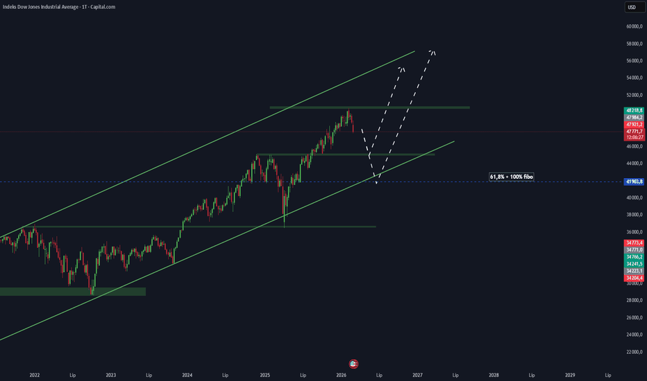 DJ30 – Current Market SituationThe Dow Jones Industrial Average (DJ30) remains in a long-term uptrend. Since 2023 the index has been moving inside an ascending channel, consistently forming higher highs and higher lows.