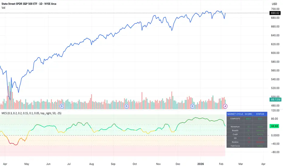 Market Cycle Strength is a comprehensive composite indicator that synthesizes six key market health metrics into a single score ranging from -100 to +100. The indicator is designed to help traders assess the current market regime and identify potential turning points by analyzing multiple dimensions of market structure simultaneously.