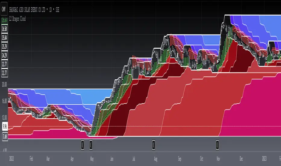 OVERVIEWThe L2 Dragon Cloud indicator combines Parabolic SAR signals with dynamic cloud levels to provide comprehensive market analysis. 🌟 This advanced script features a weighted moving average calculation and custom SAR implementation for precise trend identification. The Dragon Cloud system presents multiple resistance/support levels that form distinct colored zones, offering traders valuable insights into potential price movements.