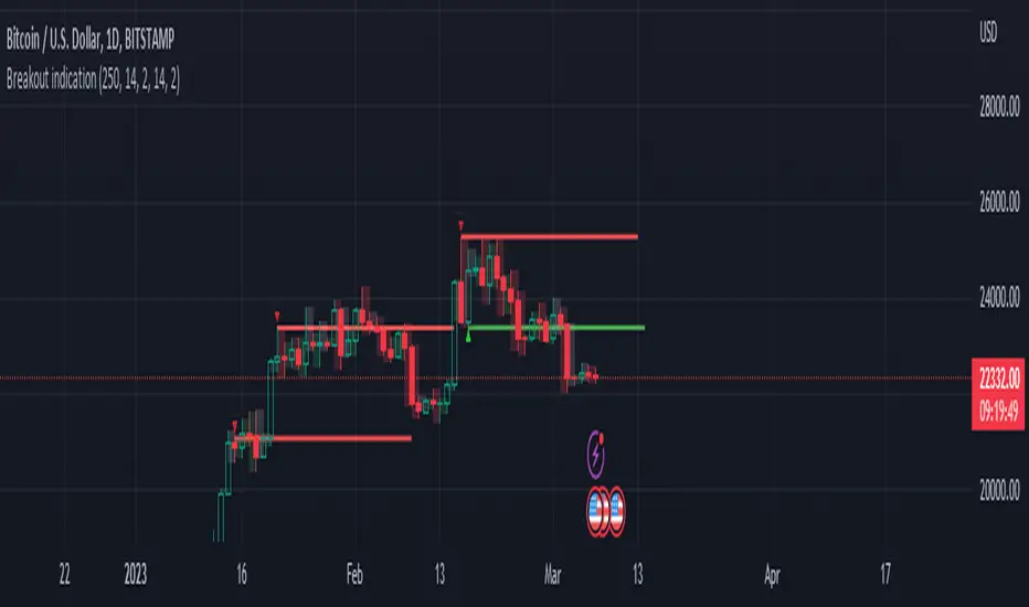 Breakout Identifier is an indicator that displays breakouts which can be used to help a trader buy or sell. This is a volatility-based indicator that has customizable inputs. Each signal is also plotted with a pivot which can help to trade within a range or determine a trap.