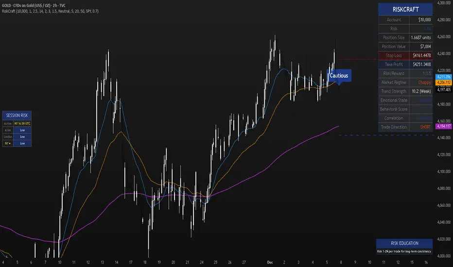 RiskCraft is an open-source Pine Script v6 indicator that keeps risk transparent directly on the chart. It is not a signal generator; it is a risk desk that calculates size, frames volatility, and reminds you when your behaviour drifts away from the plan.