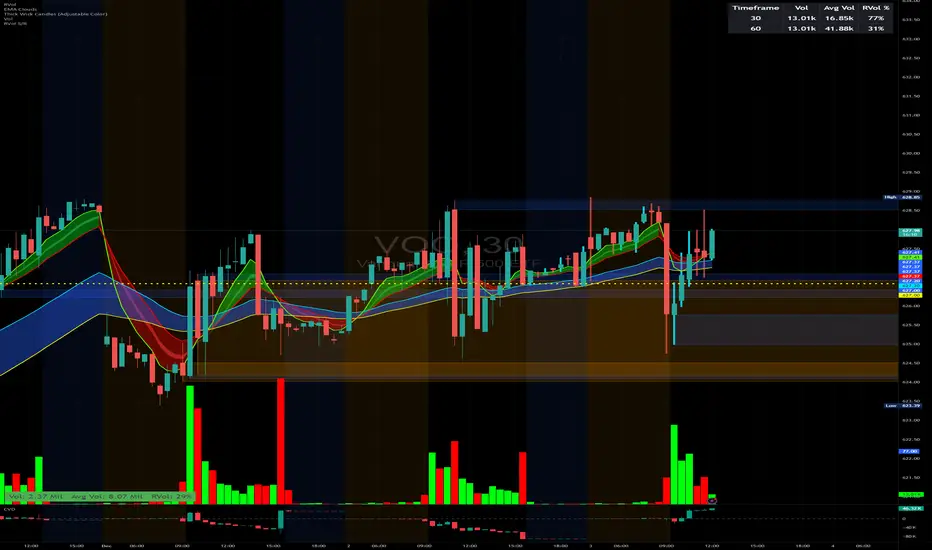 - RVol Boxes: Automatically draws boxes extending from high-volume candles.