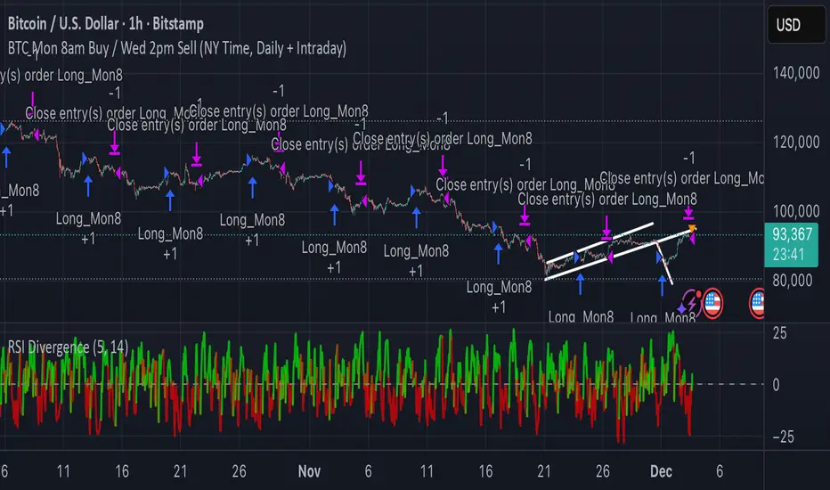 BTC Mon 8am Buy / Wed 2pm Sell (NY Time, Daily + Intraday)