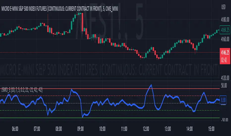 Observe the plotted JSMO_E line in relation to the zero line, overbought, and oversold levels.