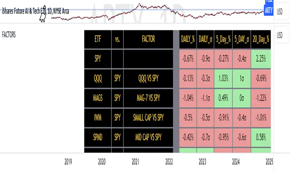 The Factor Monitor is a comprehensive designed to track relative strength and standard deviation movements across multiple market segments and investment factors. The indicator calculates and displays normalized percentage moves and their statistical significance (measured in standard deviations) across daily, 5-day, and 20-day periods, providing a multi-timeframe view of market dynamics.