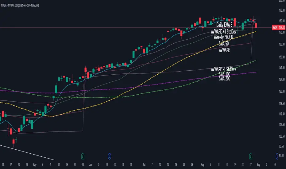 - AVWAPE / AVWAPQ (if SPY) incl. +1/-1 Stdev for each